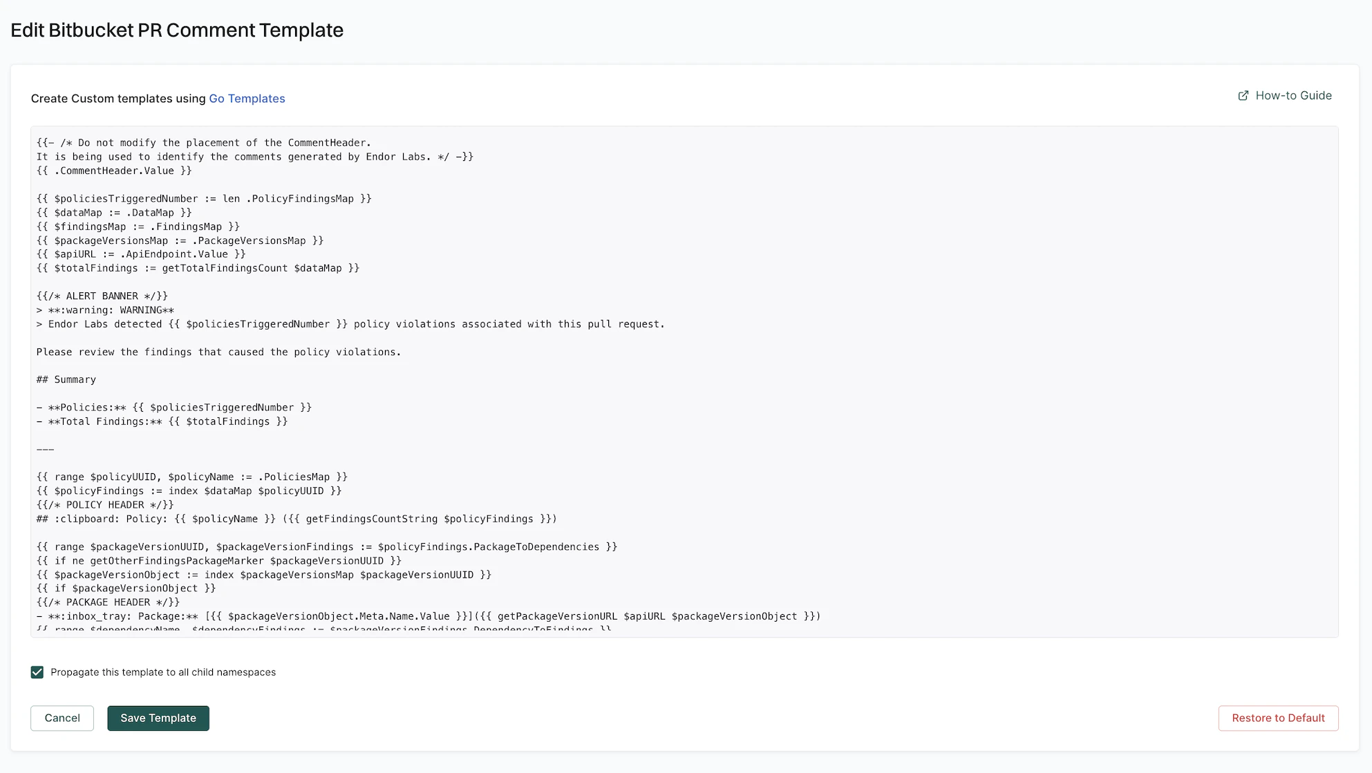 Endor Labs provides a default template for PR comments that you can use out-of-the-box. You can also create custom templates using Go Templates. The following section shows the default template for PR comments. You can create your custom template by editing the default template and saving the changes. The following specification shows the additional functions that you can use in your custom template. You can access these functions by using their corresponding keys. To edit the default template:- Select Manage > Integrations from the left sidebar.