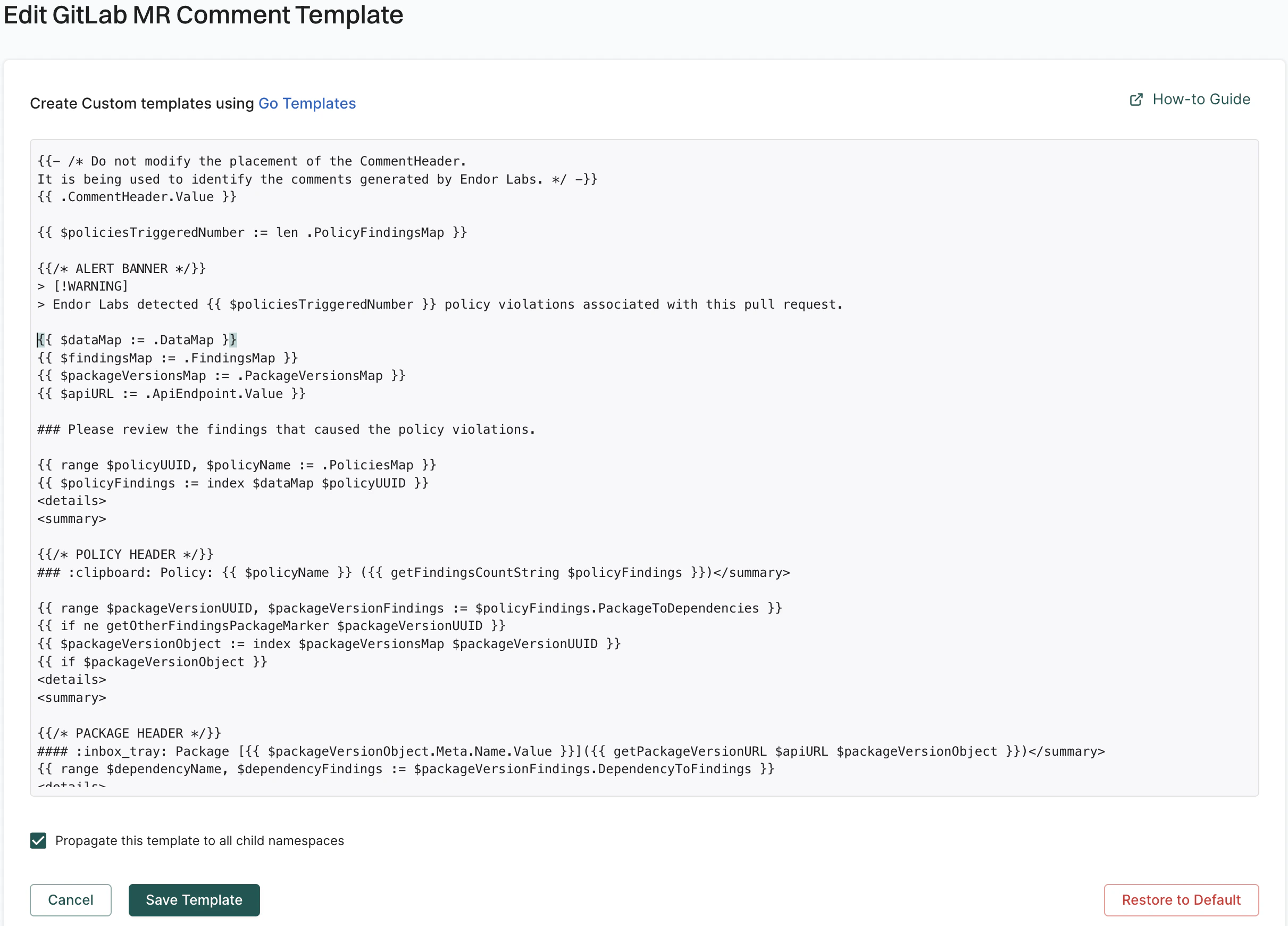 Endor Labs provides a default template for MR comments that you can use out-of-the-box. You can also create custom templates using Go Templates. The following section shows the default template for MR comments. You can create your custom template by editing the default template and saving the changes. The following specification shows the additional functions that you can use in your custom template. You can access these functions by using their corresponding keys. To edit the default template:- Select Manage > Integrations from the left sidebar.